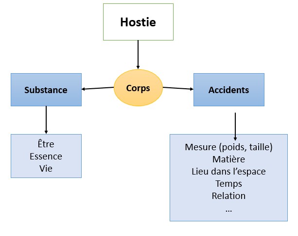 La substance désigne ce qui "est" indépendamment de ses propriétés physiques. Les catholiques considèrent que l'hostie consacrée "est" uniquement le corps du Christ tout en reconnaissant que le pain conserve ses propriétés chimiques et physiques (couleur, goût, ...). Les protestants affirment que le pain "est" du pain et "est" le corps du Christ.
